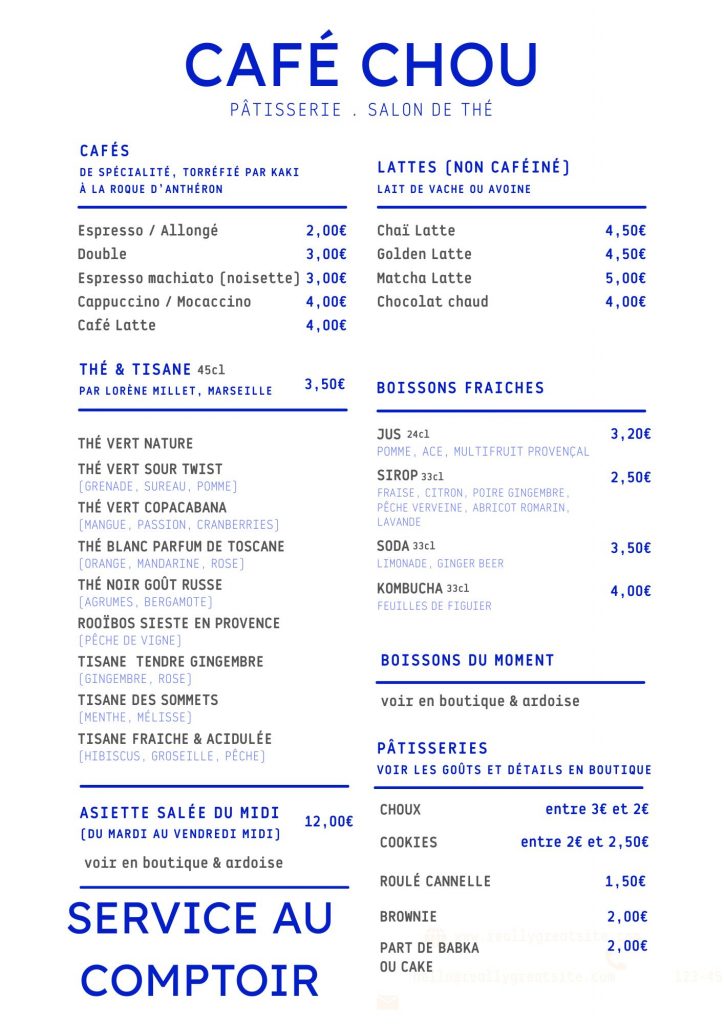 Côté boissons : café de spécialité torréfié à la Roque d’Anthéron, thés et tisanes de qualité, lattes gourmands (chaï, matcha, golden, etc.), jus et sirops locaux, sodas artisanaux.